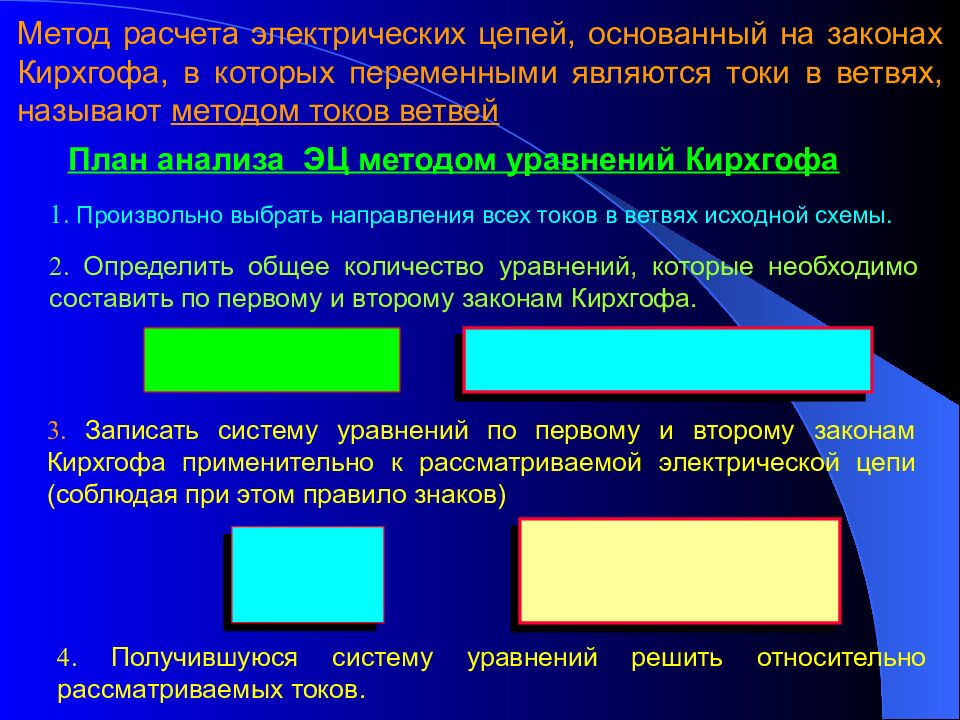 Метод расчета электрических цепей, основанный на законах Кирхгофа, в которых переменными являются токи в ветвях, называют методом токов ветвей План анализа ЭЦ методом уравнений Кирхгофа 1. Произвольно выбрать направления всех токов в ветвях исходной схемы. 2. Определить общее количество уравнений, которые необходимо составить по первому и второму законам Кирхгофа. 3. Записать систему уравнений по первому и второму законам Кирхгофа применительно к рассматриваемой электрической цепи (соблюдая при этом правило знаков) 4. Получившуюся систему уравнений решить относительно рассматриваемых токов.