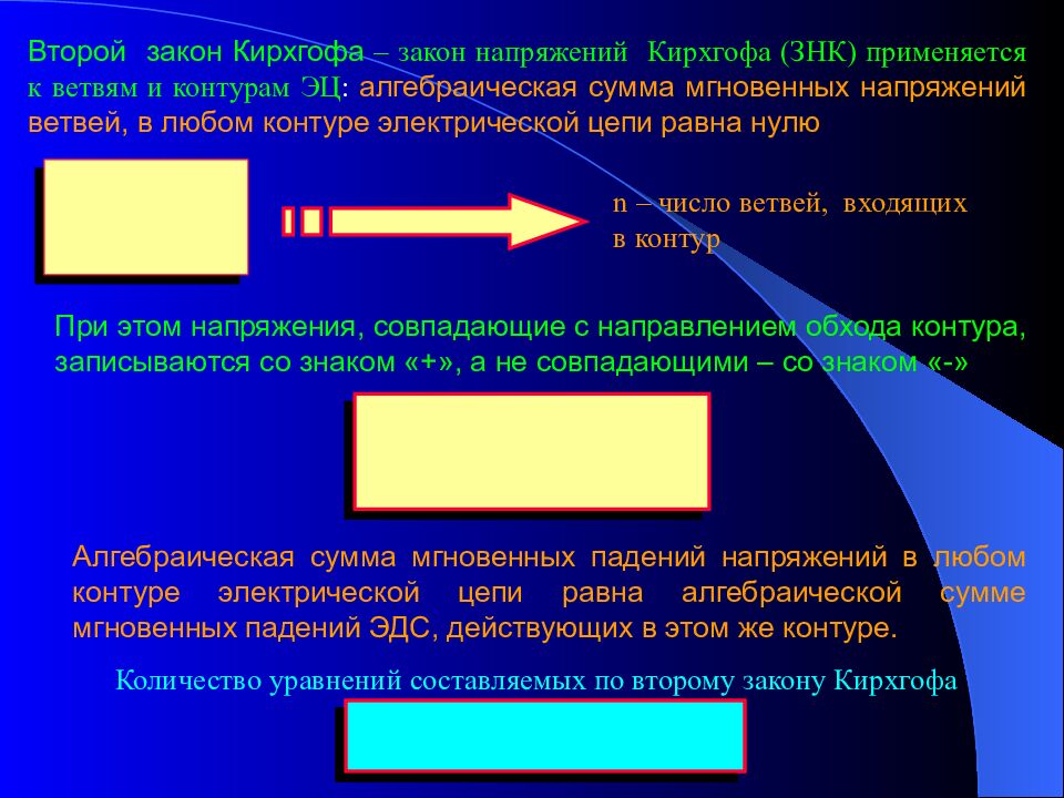 Второй закон Кирхгофа – закон напряжений Кирхгофа (ЗНК) применяется к ветвям и контурам ЭЦ : алгебраическая сумма мгновенных напряжений ветвей, в любом контуре электрической цепи равна нулю n – число ветвей, входящих в контур При этом напряжения, совпадающие с направлением обхода контура, записываются со знаком «+», а не совпадающими – со знаком «-» Алгебраическая сумма мгновенных падений напряжений в любом контуре электрической цепи равна алгебраической сумме мгновенных падений ЭДС, действующих в этом же контуре. Количество уравнений составляемых по второму закону Кирхгофа