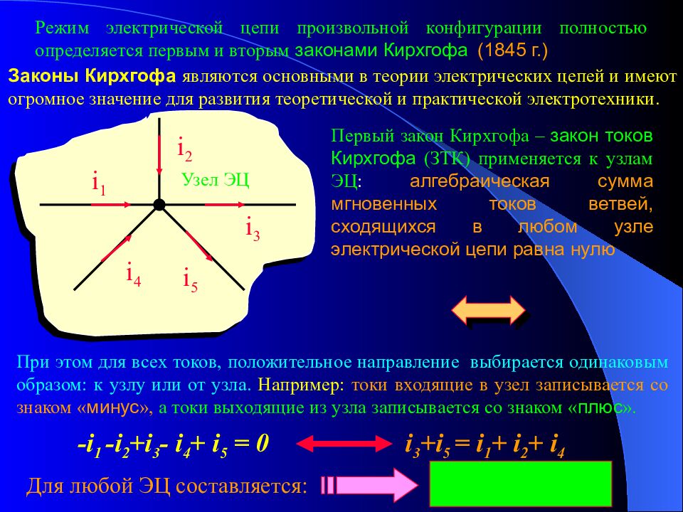 Законы Кирхгофа являются основными в теории электрических цепей и имеют огромное значение для развития теоретической и практической электротехники. Режим электрической цепи произвольной конфигурации полностью определяется первым и вторым законами Кирхгофа (1845 г.) Узел ЭЦ i 1 i 2 i 3 i 4 i 5 Первый закон Кирхгофа – закон токов Кирхгофа (ЗТК) применяется к узлам ЭЦ : алгебраическая сумма мгновенных токов ветвей, сходящихся в любом узле электрической цепи равна нулю При этом для всех токов, положительное направление выбирается одинаковым образом : к узлу или от узла. Например : токи входящие в узел записывается со знаком « минус », а токи выходящие из узла записывается со знаком « плюс ». -i 1 -i 2 +i 3 - i 4 + i 5 = 0 i 3 +i 5 = i 1 + i 2 + i 4 Для любой ЭЦ составляется :