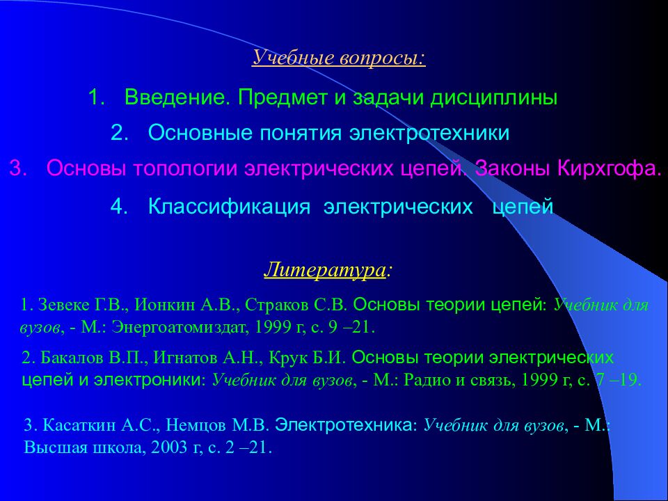 Учебные вопросы : 1. Введение. Предмет и задачи дисциплины 2. Основные понятия электротехники 3. Основы топологии электрических цепей. Законы Кирхгофа. 4. Классификация электрических цепей Литература : 1. Зевеке Г.В., Ионкин А.В., Страков С.В. Основы теории цепей : Учебник для вузов, - М. : Энергоатомиздат, 1999 г, с. 9 –21. 2. Бакалов В.П., Игнатов А.Н., Крук Б.И. Основы теории электрических цепей и электроники : Учебник для вузов, - М. : Радио и связь, 1999 г, с. 7 –19. 3. Касаткин А.С., Немцов М.В. Электротехника : Учебник для вузов, - М. : Высшая школа, 2003 г, с. 2 –21.