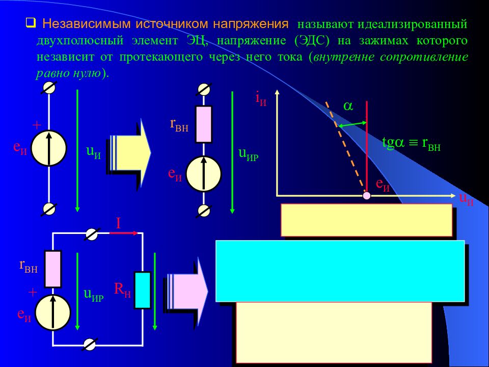 Независимым источником напряжения называют идеализированный двухполюсный элемент ЭЦ, напряжение (ЭДС) на зажимах которого независит от протекающего через него тока ( внутренне сопротивление равно нулю ). е И u ИР r ВН i И u И е И tg r ВН е И u И + е И u ИР r ВН R Н + I
