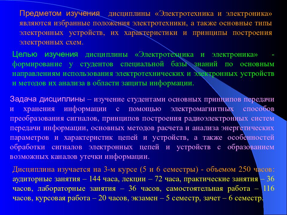 Предметом изучения дисциплины «Электротехника и электроника» являются избранные положения электротехники, а также основные типы электронных устройств, их характеристики и принципы построения электронных схем. Целью изучения дисциплины «Электротехника и электроника» - формирование у студентов специальной базы знаний по основным направлениям использования электротехнических и электронных устройств и методов их анализа в области защиты информации. Задача дисциплины – изучение студентами основных принципов передачи и хранения информации с помощью электромагнитных способов преобразования сигналов, принципов построения радиоэлектронных систем передачи информации, основных методов расчета и анализа энергетических параметров и характеристик цепей и устройств, а также особенностей обработки сигналов электронных цепей и устройств с образованием возможных каналов утечки информации. Дисциплина изучается на 3-м курсе (5 и 6 семестры) - объемом 250 часов : аудиторные занятия – 144 часа, лекции – 72 часа, практические занятия – 36 часов, лабораторные занятия – 36 часов, самостоятельная работа – 116 часов, курсовая работа – 20 часов, экзамен – 5 семестр, зачет – 6 семестр.