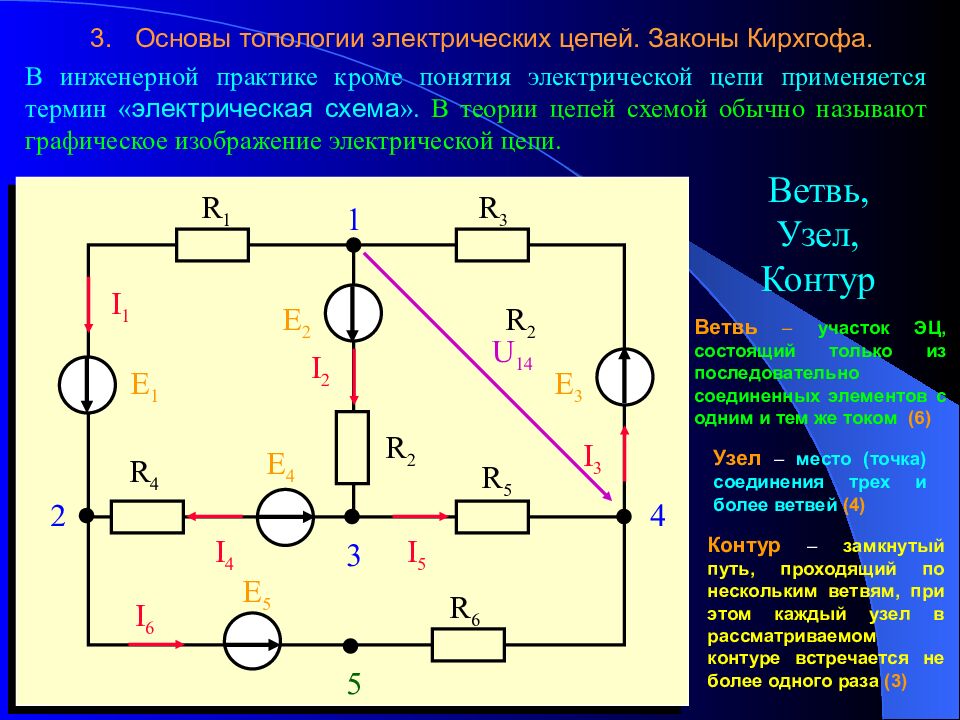3. Основы топологии электрических цепей. Законы Кирхгофа. В инженерной практике кроме понятия электрической цепи применяется термин « электрическая схема ». В теории цепей схемой обычно называют графическое изображение электрической цепи. 1 2 3 4 5 I 1 I 2 I 3 I 4 I 5 I 6 U 14 R 1 R 2 R 2 R 3 E 1 E 2 E 3 E 4 E 5 R 4 R 5 R 6 Ветвь, Узел, Контур Ветвь – участок ЭЦ, состоящий только из последовательно соединенных элементов с одним и тем же током (6) Узел – место (точка) соединения трех и более ветвей (4) Контур – замкнутый путь, проходящий по нескольким ветвям, при этом каждый узел в рассматриваемом контуре встречается не более одного раза (3)