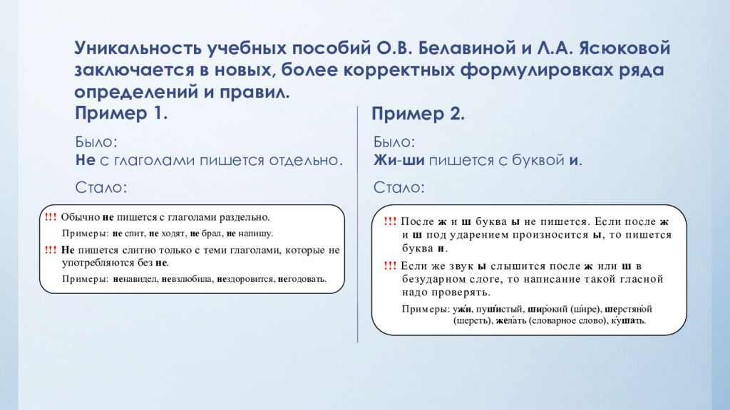 Слайд 11: Уникальность учебных пособий О.В. Белавиной и Л.А. Ясюковой заключается в новых, более корректных формулировках ряда определений и правил