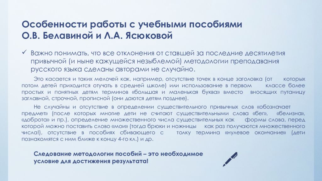 Особенности работы с учебными пособиями О.В. Белавиной и Л.А. Ясюковой Важно понимать, что все отклонения от ставшей за последние десятилетия привычной (и ныне кажущейся незыблемой) методологии преподавания русского языка сделаны авторами не случайно. Это касается и таких мелочей как, например, отсутствие точек в конце заголовка (от которых потом детей приходится отучать в средней школе) или использование в первом классе более простых и понятных детям терминов «большая и маленькая буква» вместо вносящих путаницу заглавной, строчной, прописной (они даются детям позднее). Не случайны и отсутствие в определении существительного привычных слов «обозначает предмет» (после которых многие дети не считают существительными слова «бег», «белизна», «доброта» и пр.), определение множественного числа существительных как формы слова, перед которой можно поставить слово «мои» (тогда брюки и ножницы как раз получаются множественного числа!), отсутствие в пособиях сбивающего с толку термина «нулевое окончание» (дети познакомятся с ним ближе к концу 4-го кл.) и др. Следование методологии пособий – это необходимое условие для достижения результата!