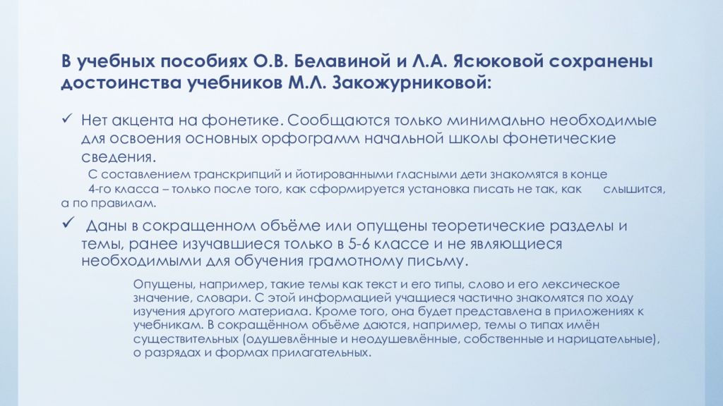 В учебных пособиях О.В. Белавиной и Л.А. Ясюковой сохранены достоинства учебников М.Л. Закожурниковой : Нет акцента на фонетике. Сообщаются только минимально необходимые для освоения основных орфограмм начальной школы фонетические сведения. С составлением транскрипций и йотированными гласными дети знакомятся в конце 4-го класса – только после того, как сформируется установка писать не так, как слышится, а по правилам. Даны в сокращенном объёме или опущены теоретические разделы и темы, ранее изучавшиеся только в 5-6 классе и не являющиеся необходимыми для обучения грамотному письму. Опущены, например, такие темы как текст и его типы, слово и его лексическое значение, словари. С этой информацией учащиеся частично знакомятся по ходу изучения другого материала. Кроме того, она будет представлена в приложениях к учебникам. В сокращённом объёме даются, например, темы о типах имён существительных (одушевлённые и неодушевлённые, собственные и нарицательные), о разрядах и формах прилагательных.