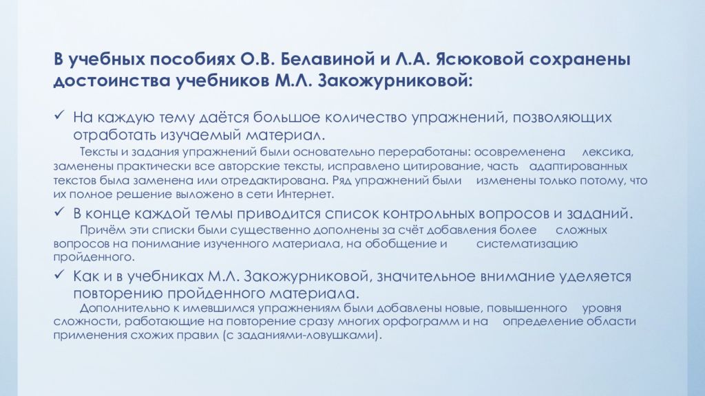 В учебных пособиях О.В. Белавиной и Л.А. Ясюковой сохранены достоинства учебников М.Л. Закожурниковой : На каждую тему даётся большое количество упражнений, позволяющих отработать изучаемый материал. Тексты и задания упражнений были основательно переработаны: осовременена лексика, заменены практически все авторские тексты, исправлено цитирование, часть адаптированных текстов была заменена или отредактирована. Ряд упражнений были изменены только потому, что их полное решение выложено в сети Интернет. В конце каждой темы приводится список контрольных вопросов и заданий. Причём эти списки были существенно дополнены за счёт добавления более сложных вопросов на понимание изученного материала, на обобщение и систематизацию пройденного. Как и в учебниках М.Л. Закожурниковой, значительное внимание уделяется повторению пройденного материала. Дополнительно к имевшимся упражнениям были добавлены новые, повышенного уровня сложности, работающие на повторение сразу многих орфограмм и на определение области применения схожих правил (с заданиями-ловушками).
