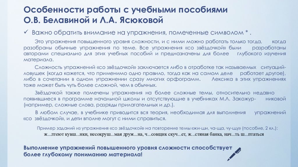 Особенности работы с учебными пособиями О.В. Белавиной и Л.А. Ясюковой Важно обратить внимание на упражнения, помеченные символом *. Это упражнения повышенного уровня сложности, и с ними можно работать только тогда, когда разобраны обычные упражнения по теме. Все упражнения «со звёздочкой» были разработаны авторами специально для этих учебных пособий и предназначены для более глубокого изучения материала. Сложность упражнений «со звёздочкой» заключается либо в отработке так называемых ситуаций-ловушек (когда кажется, что применимо одно правило, тогда как на самом деле работает другое), либо в сочетании в одном упражнении сразу многих орфограмм. Лексика в этих упражнениях тоже может быть чуть более сложной, чем в обычных. Звёздочкой также помечены упражнения на более сложные темы, относительно недавно появившиеся в программе начальной школы и отсутствующие в учебниках М.Л. Закожур - никовой (например, сложные слова, разряды прилагательных и др.). В любом случае, в учебнике приводится вся теория, необходимая для выполнения упражнений «со звёздочкой», и дети вполне могут с ними справиться. Пример заданий из упражнения «со звёздочкой» на повторение темы « жи -ши, ча -ща, чу- щу » (пособие, 2 кл.): ж... лтеют кувш... нки, несокруш...мая друж...на, ч... совщик скуч... ет, ж... стяная банка, нач... ть ш... птаться Выполнение упражнений повышенного уровня сложности способствует более глубокому пониманию материала!