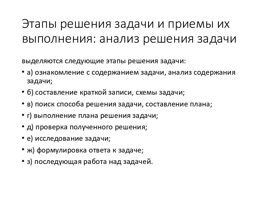 выделяются следующие этапы решения задачи: а) ознакомление с содержанием задачи, анализ содержания задачи; б) составление краткой записи, схемы задачи; в) поиск способа решения задачи, составление плана; г) выполнение плана решения задачи; д) проверка полученного решения; е) исследование задачи; ж) формулировка ответа к задаче; з) последующая работа над задачей.