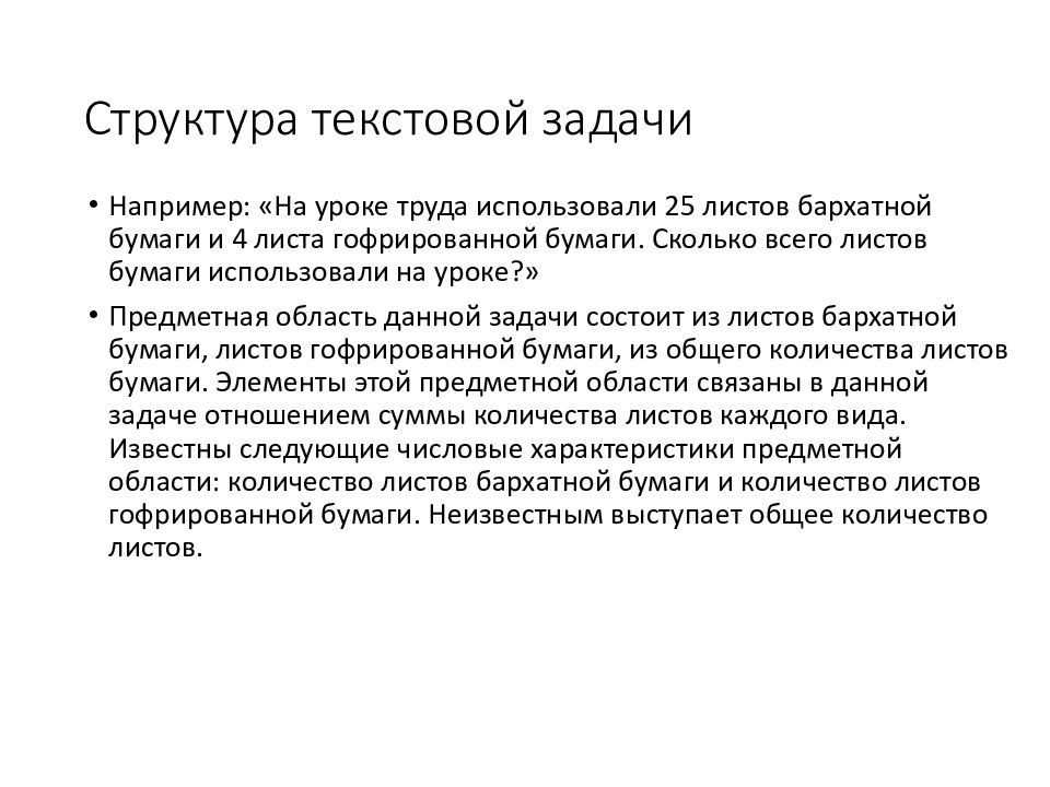 Например: «На уроке труда использовали 25 листов бархатной бумаги и 4 листа гофрированной бумаги. Сколько всего листов бумаги использовали на уроке?» Предметная область данной задачи состоит из листов бархатной бумаги, листов гофрированной бумаги, из общего количества листов бумаги. Элементы этой предметной области связаны в данной задаче отношением суммы количества листов каждого вида. Известны следующие числовые характеристики предметной области: количество листов бархатной бумаги и количество листов гофрированной бумаги. Неизвестным выступает общее количество листов.