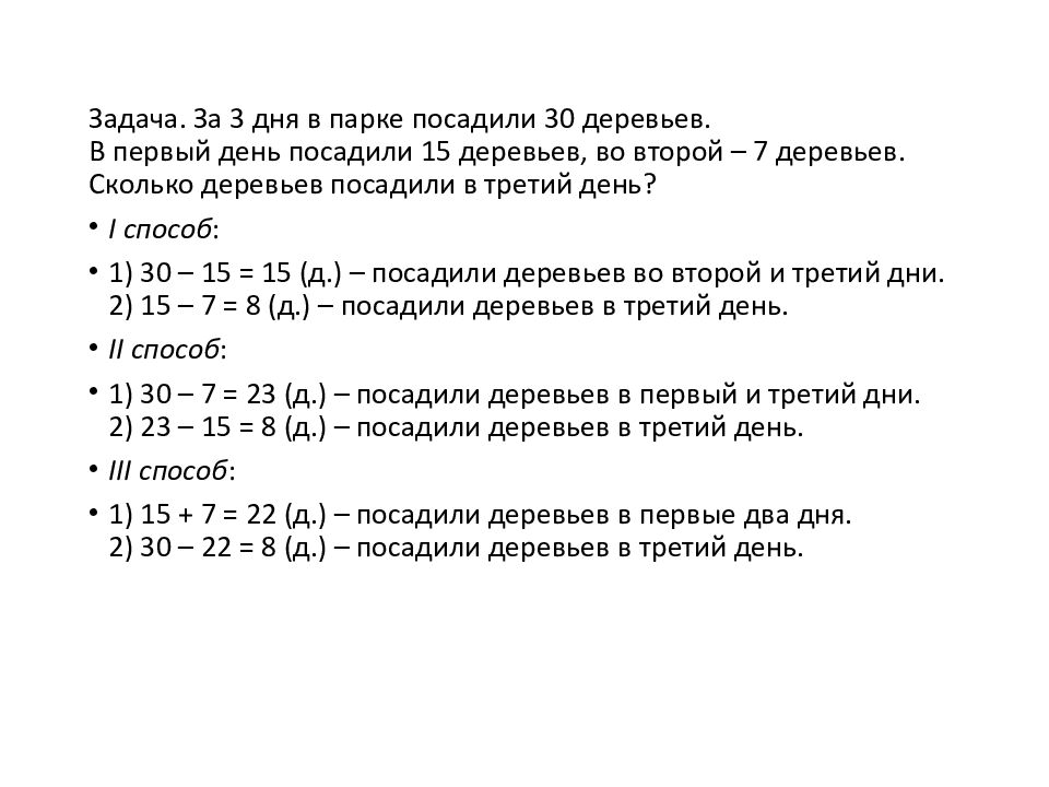 Задача. За 3 дня в парке посадили 30 деревьев. В первый день посадили 15 деревьев, во второй – 7 деревьев. Сколько деревьев посадили в третий день ? I способ : 1) 30 – 15 = 15 (д.) – посадили деревьев во второй и третий дни. 2) 15 – 7 = 8 (д.) – посадили деревьев в третий день. II способ : 1) 30 – 7 = 23 (д.) – посадили деревьев в первый и третий дни. 2) 23 – 15 = 8 (д.) – посадили деревьев в третий день. III способ : 1) 15 + 7 = 22 (д.) – посадили деревьев в первые два дня. 2) 30 – 22 = 8 (д.) – посадили деревьев в третий день.