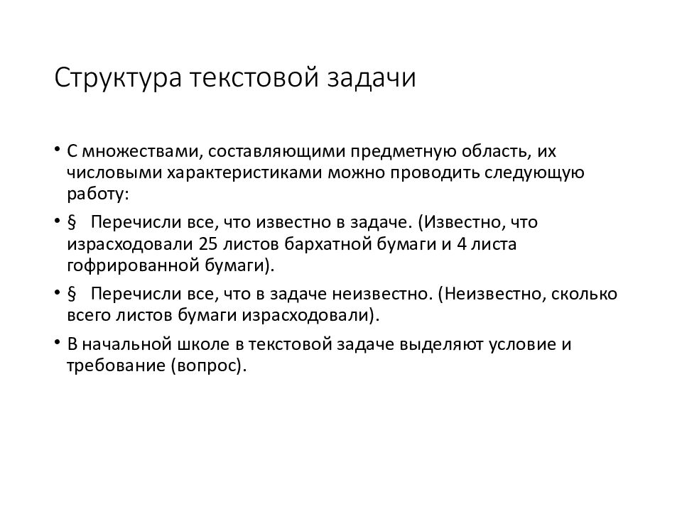 С множествами, составляющими предметную область, их числовыми характеристиками можно проводить следующую работу: § Перечисли все, что известно в задаче. (Известно, что израсходовали 25 листов бархатной бумаги и 4 листа гофрированной бумаги). § Перечисли все, что в задаче неизвестно. (Неизвестно, сколько всего листов бумаги израсходовали). В начальной школе в текстовой задаче выделяют условие и требование (вопрос).