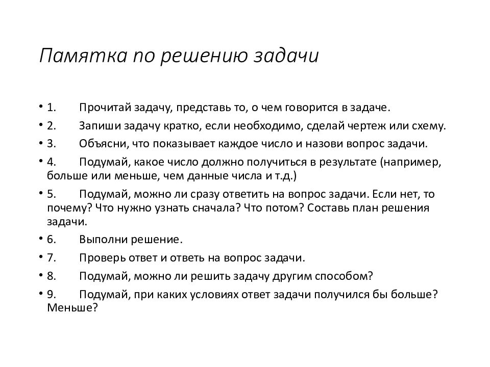 1. Прочитай задачу, представь то, о чем говорится в задаче. 2. Запиши задачу кратко, если необходимо, сделай чертеж или схему. 3. Объясни, что показывает каждое число и назови вопрос задачи. 4. Подумай, какое число должно получиться в результате (например, больше или меньше, чем данные числа и т.д.) 5. Подумай, можно ли сразу ответить на вопрос задачи. Если нет, то почему? Что нужно узнать сначала? Что потом? Составь план решения задачи. 6. Выполни решение. 7. Проверь ответ и ответь на вопрос задачи. 8. Подумай, можно ли решить задачу другим способом? 9. Подумай, при каких условиях ответ задачи получился бы больше? Меньше?