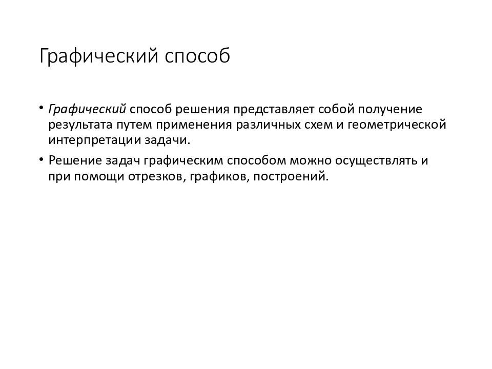 Графический способ решения представляет собой получение результата путем применения различных схем и геометрической интерпретации задачи. Решение задач графическим способом можно осуществлять и при помощи отрезков, графиков, построений.