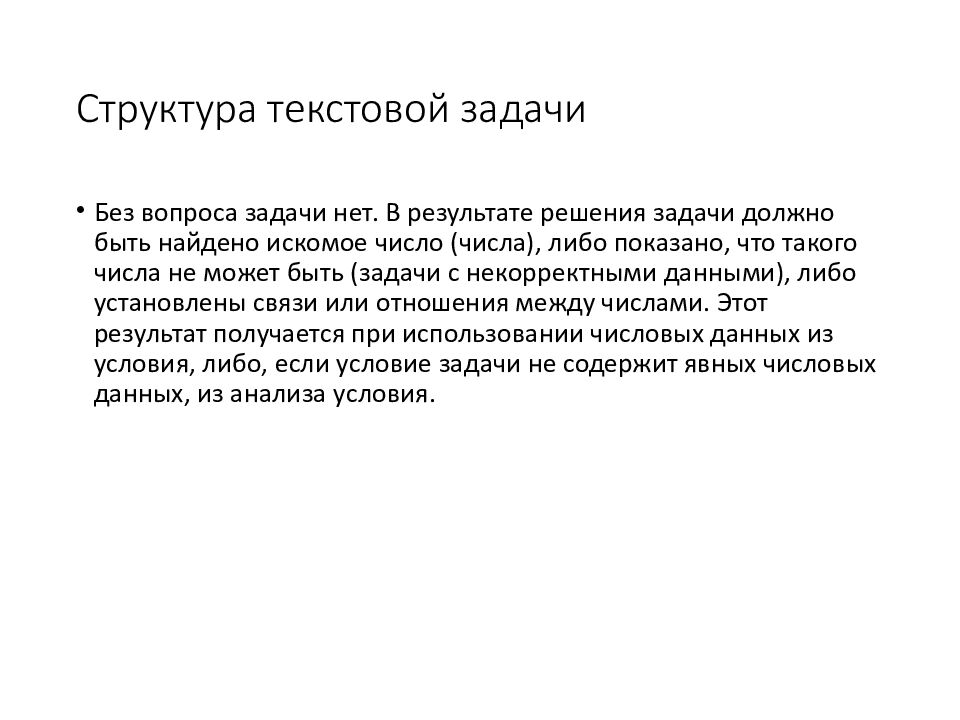 Без вопроса задачи нет. В результате решения задачи должно быть найдено искомое число (числа), либо показано, что такого числа не может быть (задачи с некорректными данными), либо установлены связи или отношения между числами. Этот результат получается при использовании числовых данных из условия, либо, если условие задачи не содержит явных числовых данных, из анализа условия.