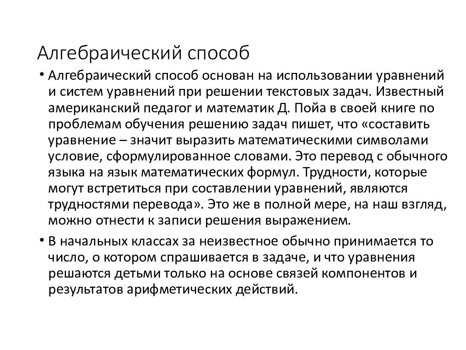 Алгебраический способ основан на использовании уравнений и систем уравнений при решении текстовых задач. Известный американский педагог и математик Д. Пойа в своей книге по проблемам обучения решению задач пишет, что «составить уравнение – значит выразить математическими символами условие, сформулированное словами. Это перевод с обычного языка на язык математических формул. Трудности, которые могут встретиться при составлении уравнений, являются трудностями перевода». Это же в полной мере, на наш взгляд, можно отнести к записи решения выражением. В начальных классах за неизвестное обычно принимается то число, о котором спрашивается в задаче, и что уравнения решаются детьми только на основе связей компонентов и результатов арифметических действий.
