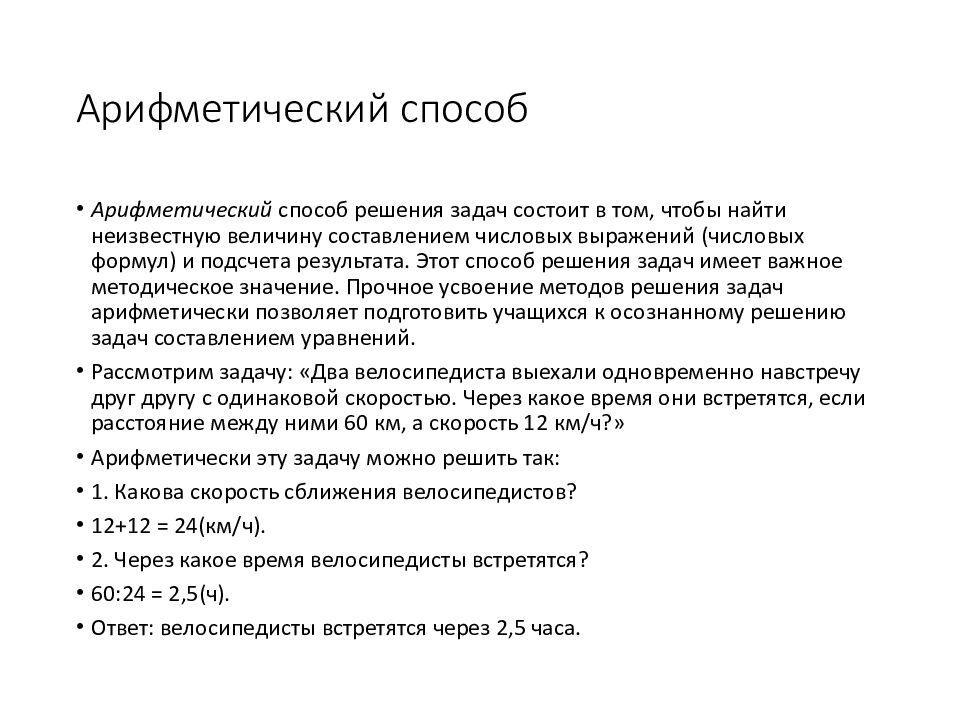 Арифметический способ решения задач состоит в том, чтобы найти неизвестную величину составлением числовых выражений (числовых формул) и подсчета результата. Этот способ решения задач имеет важное методическое значение. Прочное усвоение методов решения задач арифметически позволяет подготовить учащихся к осознанному решению задач составлением уравнений. Рассмотрим задачу: «Два велосипедиста выехали одновременно навстречу друг другу с одинаковой скоростью. Через какое время они встретятся, если расстояние между ними 60 км, а скорость 12 км/ч?» Арифметически эту задачу можно решить так: 1. Какова скорость сближения велосипедистов? 12+12 = 24(км/ч). 2. Через какое время велосипедисты встретятся? 60:24 = 2,5(ч). Ответ: велосипедисты встретятся через 2,5 часа.