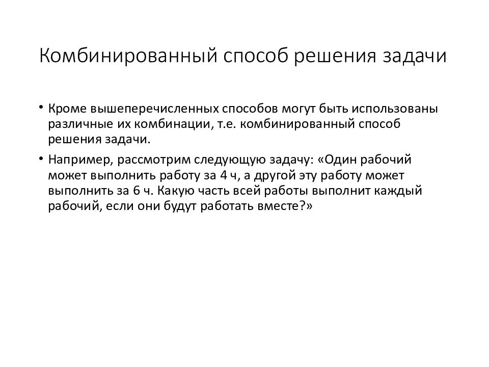 Кроме вышеперечисленных способов могут быть использованы различные их комбинации, т.е. комбинированный способ решения задачи. Например, рассмотрим следующую задачу: «Один рабочий может выполнить работу за 4 ч, а другой эту работу может выполнить за 6 ч. Какую часть всей работы выполнит каждый рабочий, если они будут работать вместе?»