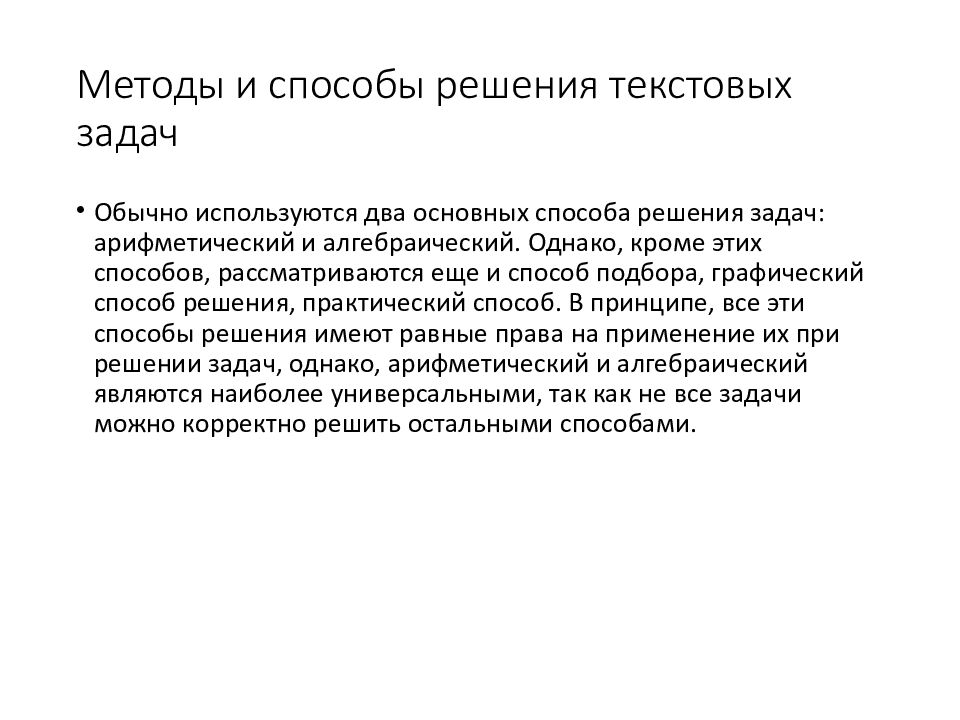 Обычно используются два основных способа решения задач: арифметический и алгебраический. Однако, кроме этих способов, рассматриваются еще и способ подбора, графический способ решения, практический способ. В принципе, все эти способы решения имеют равные права на применение их при решении задач, однако, арифметический и алгебраический являются наиболее универсальными, так как не все задачи можно корректно решить остальными способами.