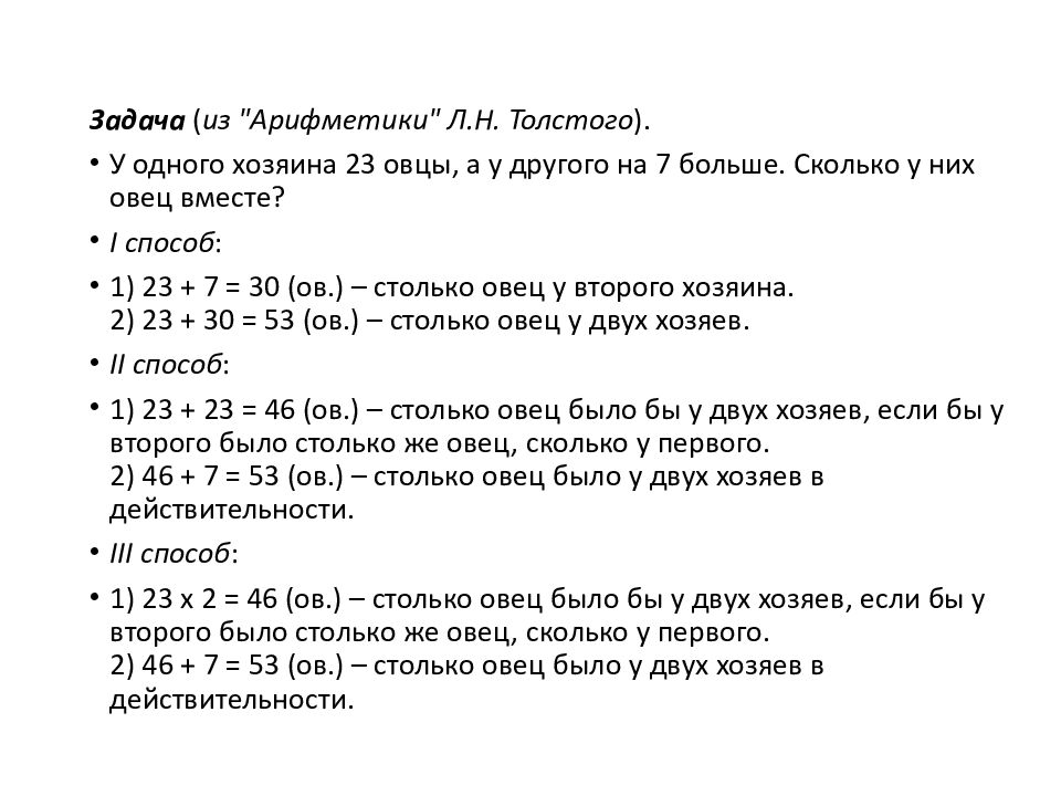 Задача ( из "Арифметики" Л.Н. Толстого ). У одного хозяина 23 овцы, а у другого на 7 больше. Сколько у них овец вместе? I способ : 1) 23 + 7 = 30 ( ов.) – столько овец у второго хозяина. 2) 23 + 30 = 53 ( ов.) – столько овец у двух хозяев. II способ : 1) 23 + 23 = 46 ( ов.) – столько овец было бы у двух хозяев, если бы у второго было столько же овец, сколько у первого. 2) 46 + 7 = 53 ( ов.) – столько овец было у двух хозяев в действительности. III способ : 1) 23 x 2 = 46 ( ов.) – столько овец было бы у двух хозяев, если бы у второго было столько же овец, сколько у первого. 2) 46 + 7 = 53 ( ов.) – столько овец было у двух хозяев в действительности.