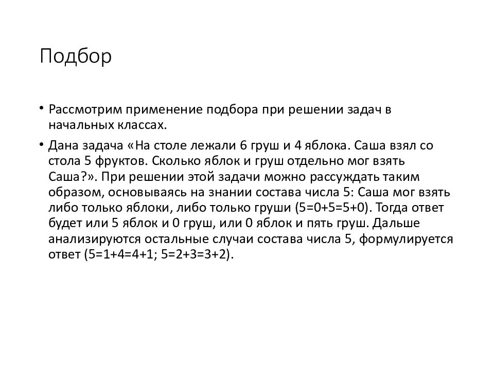 Рассмотрим применение подбора при решении задач в начальных классах. Дана задача «На столе лежали 6 груш и 4 яблока. Саша взял со стола 5 фруктов. Сколько яблок и груш отдельно мог взять Саша?». При решении этой задачи можно рассуждать таким образом, основываясь на знании состава числа 5: Саша мог взять либо только яблоки, либо только груши (5=0+5=5+0). Тогда ответ будет или 5 яблок и 0 груш, или 0 яблок и пять груш. Дальше анализируются остальные случаи состава числа 5, формулируется ответ (5=1+4=4+1; 5=2+3=3+2).