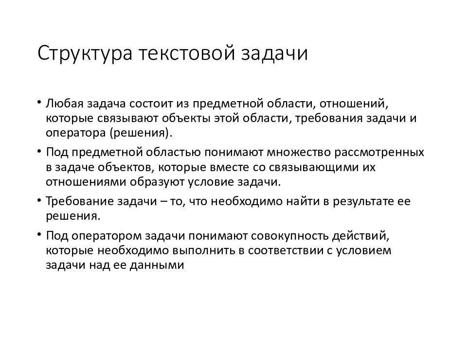 Любая задача состоит из предметной области, отношений, которые связывают объекты этой области, требования задачи и оператора (решения). Под предметной областью понимают множество рассмотренных в задаче объектов, которые вместе со связывающими их отношениями образуют условие задачи. Требование задачи – то, что необходимо найти в результате ее решения. Под оператором задачи понимают совокупность действий, которые необходимо выполнить в соответствии с условием задачи над ее данными