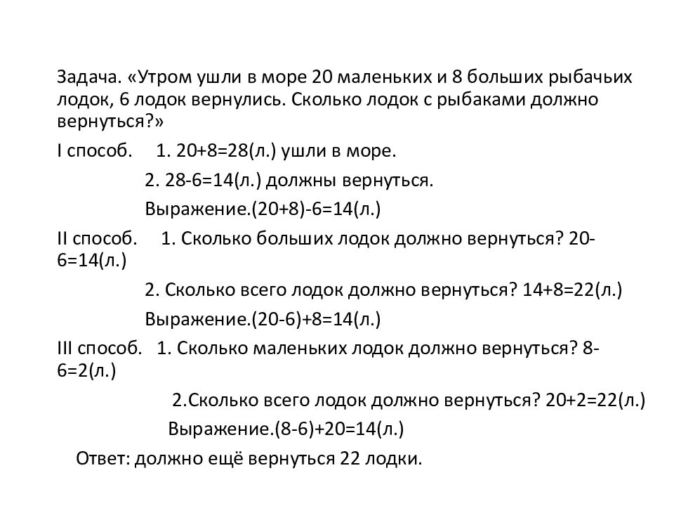 Задача. «Утром ушли в море 20 маленьких и 8 больших рыбачьих лодок, 6 лодок вернулись. Сколько лодок с рыбаками должно вернуться?» I способ. 1. 20+8=28(л.) ушли в море. 2. 28-6=14(л.) должны вернуться. Выражение.(20+8)-6=14(л.) II способ. 1. Сколько больших лодок должно вернуться? 20-6=14(л.) 2. Сколько всего лодок должно вернуться? 14+8=22(л.) Выражение.(20-6)+8=14(л.) III способ. 1. Сколько маленьких лодок должно вернуться? 8-6=2(л.) 2.Сколько всего лодок должно вернуться? 20+2=22(л.) Выражение.(8-6)+20=14(л.) Ответ: должно ещё вернуться 22 лодки.