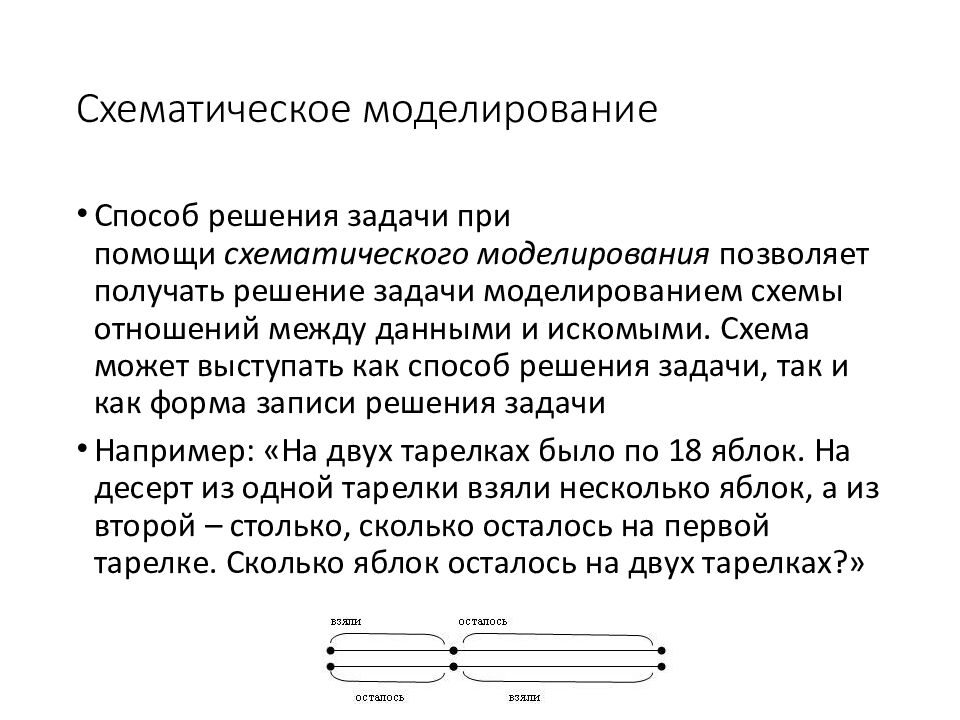 Способ решения задачи при помощи схематического моделирования позволяет получать решение задачи моделированием схемы отношений между данными и искомыми. Схема может выступать как способ решения задачи, так и как форма записи решения задачи Например: «На двух тарелках было по 18 яблок. На десерт из одной тарелки взяли несколько яблок, а из второй – столько, сколько осталось на первой тарелке. Сколько яблок осталось на двух тарелках?»
