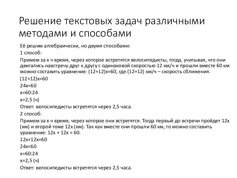 Её решим алгебраически, но двумя способами: 1 способ: Примем за х ч время, через которое встретятся велосипедисты, тогда, учитывая, что они двигались навстречу друг к другу с одинаковой скоростью 12 км/ч и прошли вместе 60 км можно составить уравнение: (12+12)х=60, где (12+12) км/ч – скорость сближения. (12+12)х=60 24х=60 х=60:24 х=2,5 (ч) Ответ: велосипедисты встретятся через 2,5 часа. 2 способ: Примем за х ч время, через которое они встретятся. Тогда первый до встречи пройдет 12х (км) и второй тоже 12х (км). Так как вместе они прошли 60 км, то можно составить уравнение: 12х + 12х = 60. 12х+12х=60 24х=60 х=60:24 х=2,5 (ч) Ответ: велосипедисты встретятся через 2,5 часа.