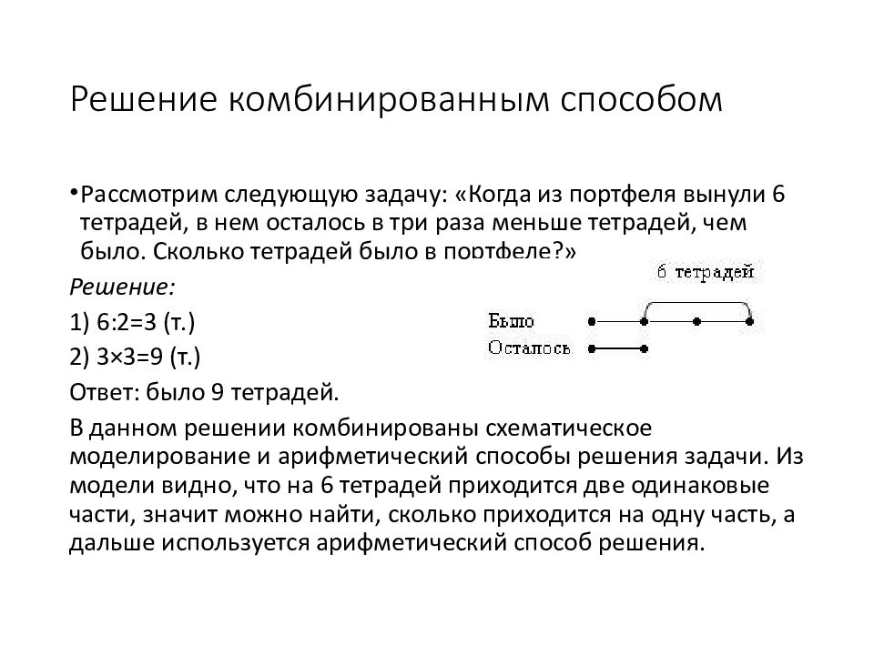 Рассмотрим следующую задачу: «Когда из портфеля вынули 6 тетрадей, в нем осталось в три раза меньше тетрадей, чем было. Сколько тетрадей было в портфеле?» Решение : 1) 6:2=3 (т.) 2) 3×3=9 (т.) Ответ: было 9 тетрадей. В данном решении комбинированы схематическое моделирование и арифметический способы решения задачи. Из модели видно, что на 6 тетрадей приходится две одинаковые части, значит можно найти, сколько приходится на одну часть, а дальше используется арифметический способ решения.