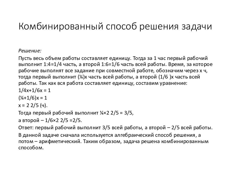 Решение: Пусть весь объем работы составляет единицу. Тогда за 1 час первый рабочий выполнит 1:4=1/4 часть, а второй 1:6=1/6 часть всей работы. Время, за которое рабочие выполнят все задание при совместной работе, обозначим через х ч, тогда первый выполнит (¼)х часть всей работы, а второй (1/6 )х часть всей работы. Так как вся работа составляет единицу, составим уравнение: 1/4х+1/6х = 1 (¼+1/6)х = 1 х = 2 2/5 (ч). Тогда первый рабочий выполнит ¼×2 2/5 = 3/5, а второй – 1/6×2 2/5 =2/5. Ответ: первый рабочий выполнит 3/5 всей работы, а второй – 2/5 всей работы. В данной задаче сначала используется алгебраический способ решения, а потом – арифметический. Таким образом, задача решена комбинированным способом.