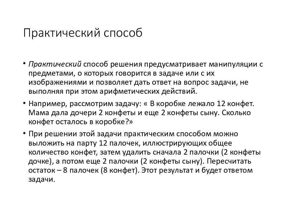 Практический способ решения предусматривает манипуляции с предметами, о которых говорится в задаче или с их изображениями и позволяет дать ответ на вопрос задачи, не выполняя при этом арифметических действий. Например, рассмотрим задачу: « В коробке лежало 12 конфет. Мама дала дочери 2 конфеты и еще 2 конфеты сыну. Сколько конфет осталось в коробке?» При решении этой задачи практическим способом можно выложить на парту 12 палочек, иллюстрирующих общее количество конфет, затем удалить сначала 2 палочки (2 конфеты дочке), а потом еще 2 палочки (2 конфеты сыну). Пересчитать остаток – 8 палочек (8 конфет). Этот результат и будет ответом задачи.