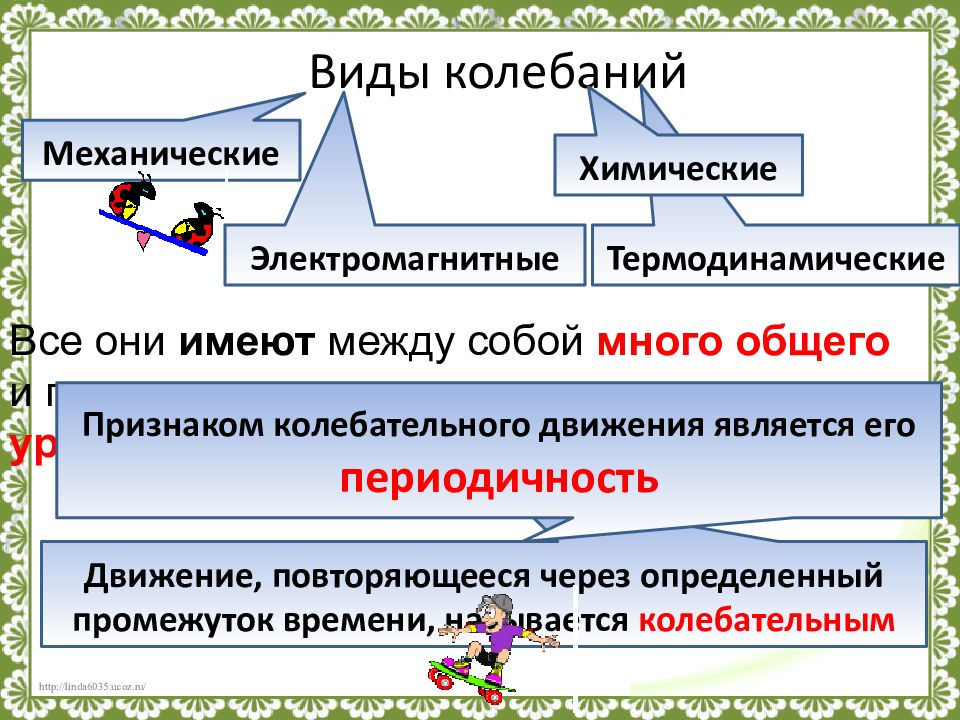 Термодинамические Виды колебаний Все они имеют между собой много общего и поэтому описываются одними и теми же уравнениями. Механические Электромагнитные Химические Движение, повторяющееся через определенный промежуток времени, называется колебательным Признаком колебательного движения является его периодичность