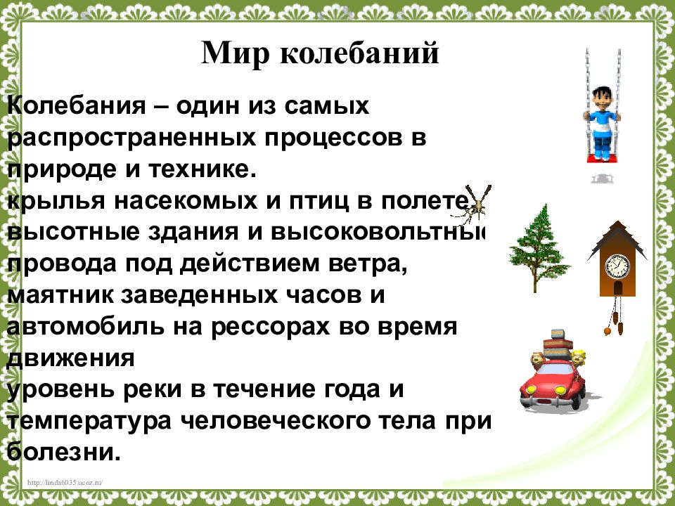 Колебания – один из самых распространенных процессов в природе и технике. крылья насекомых и птиц в полете, высотные здания и высоковольтные провода под действием ветра, маятник заведенных часов и автомобиль на рессорах во время движения уровень реки в течение года и температура человеческого тела при болезни.