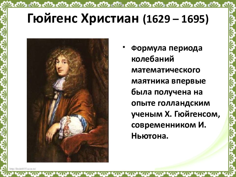 Ф ормула периода колебаний математического маятника впервые была получена на опыте голландским ученым Х. Гюйгенсом, современником И. Ньютона.