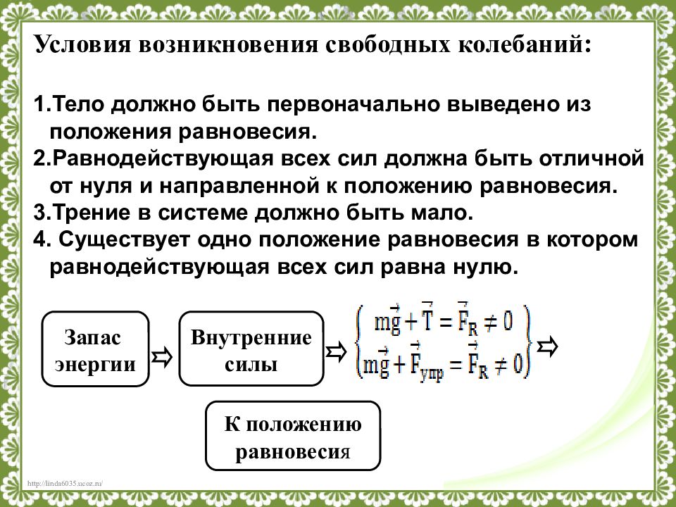 Условия возникновения свободных колебаний: Тело должно быть первоначально выведено из положения равновесия. Равнодействующая всех сил должна быть отличной от нуля и направленной к положению равновесия. Трение в системе должно быть мало. Существует одно положение равновесия в котором равнодействующая всех сил равна нулю. Запас энергии Внутренние силы К положению равновеси я