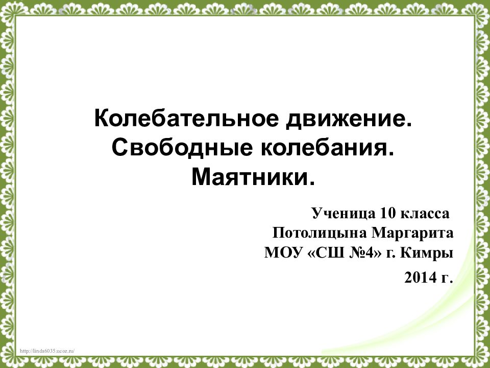 Ученица 10 класса Потолицына Маргарита МОУ «СШ №4» г. Кимры 2014 г. Колебательное движение. Свободные колебания. Маятники.