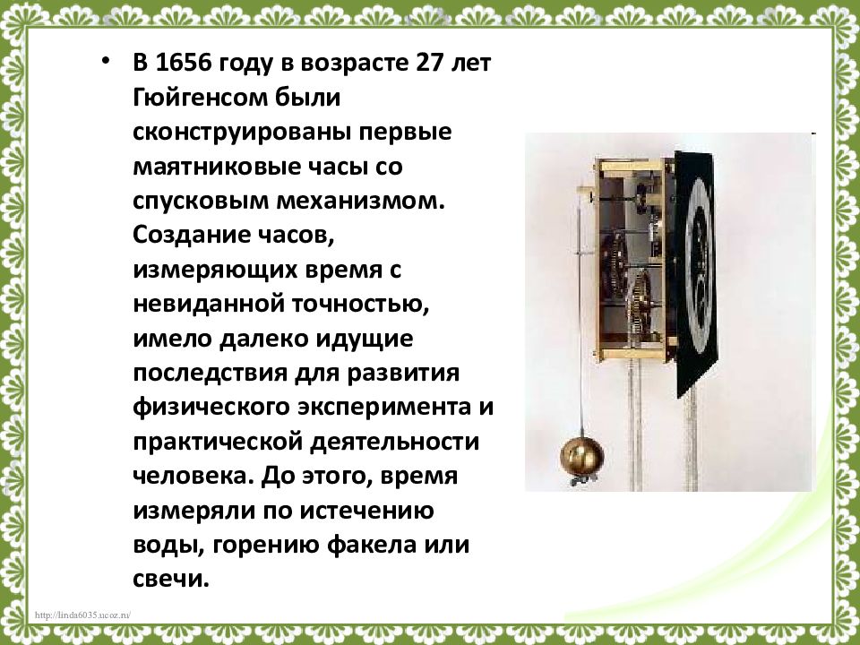 В 1656 году в возрасте 27 лет Гюйгенсом были сконструированы первые маятниковые часы со спусковым механизмом. Создание часов, измеряющих время с невиданной точностью, имело далеко идущие последствия для развития физического эксперимента и практической деятельности человека. До этого, время измеряли по истечению воды, горению факела или свечи.