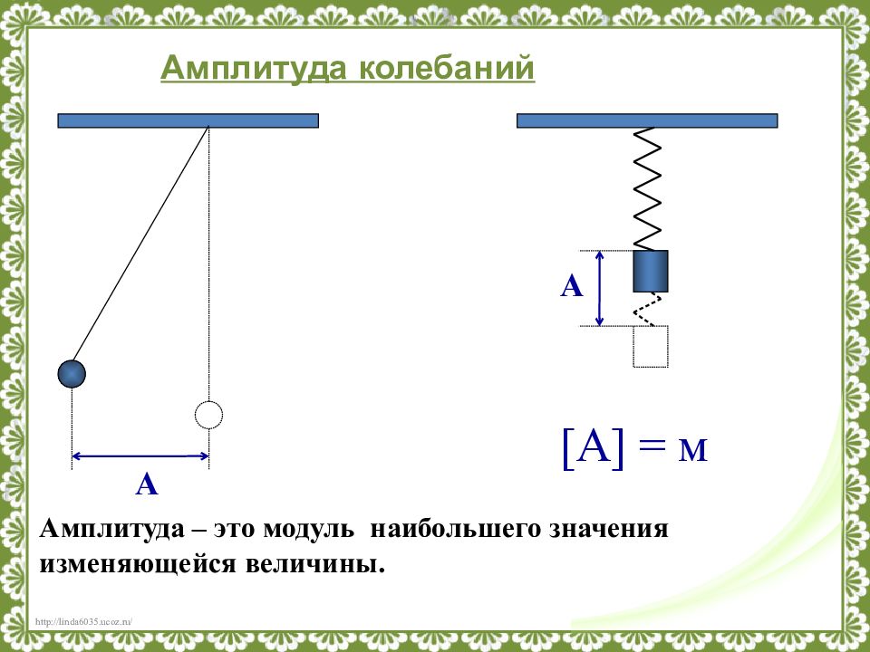 А Амплитуда – это модуль наибольшего значения изменяющейся величины. А [ А ] = м Амплитуда колебаний