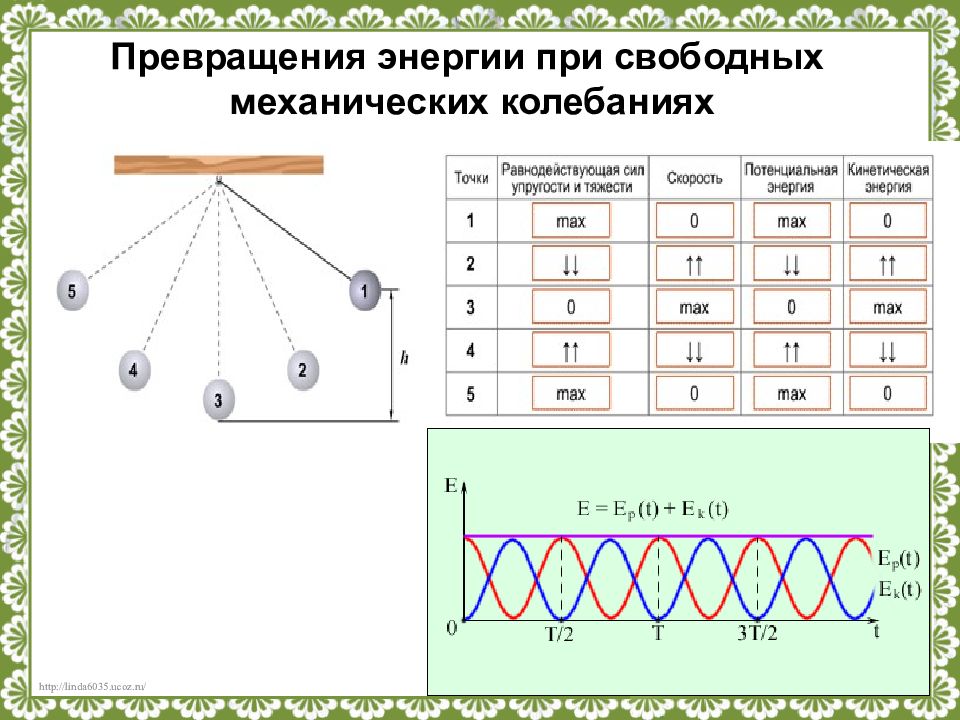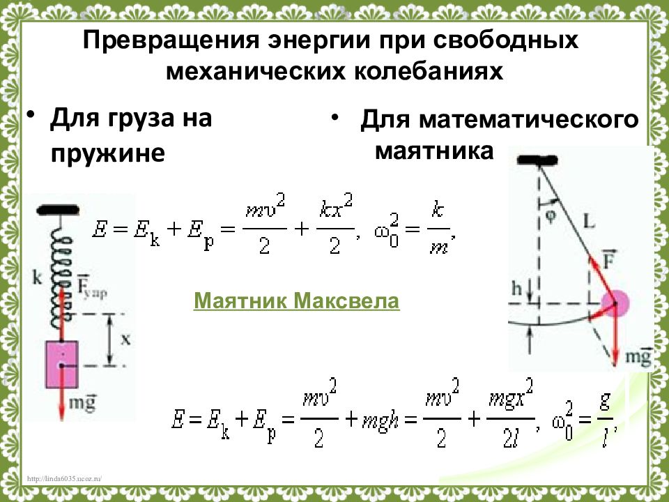 Превращения энергии при свободных механических колебаниях Для груза на пружине Для математического маятника Маятник Максвела