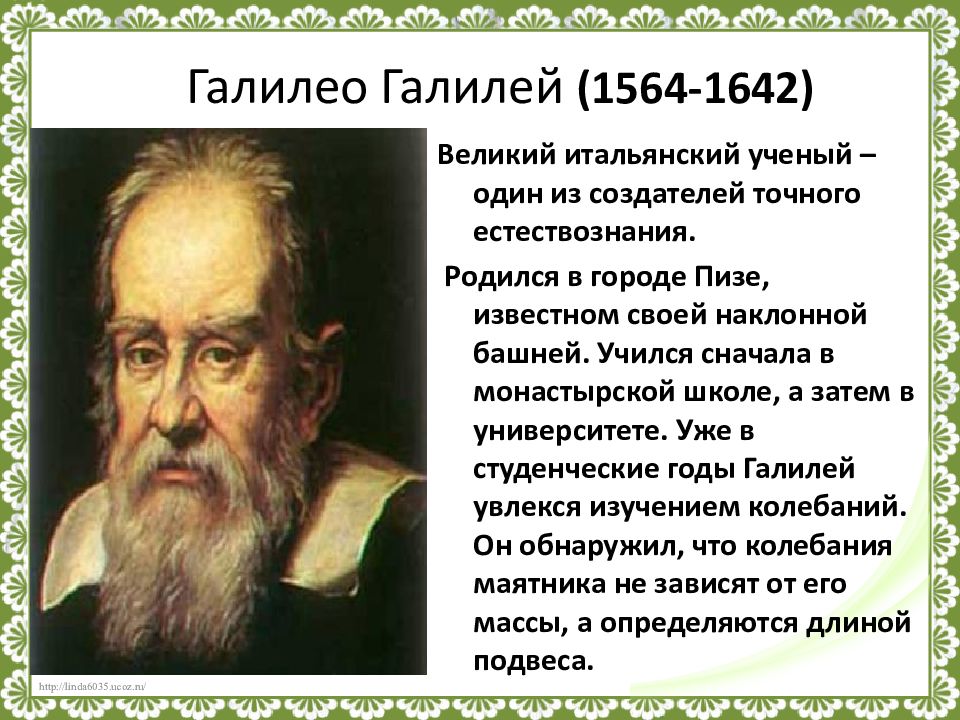 Великий итальянский ученый – один из создателей точного естествознания. Родился в городе Пизе, известном своей наклонной башней. Учился сначала в монастырской школе, а затем в университете. Уже в студенческие годы Галилей увлекся изучением колебаний. Он обнаружил, что колебания маятника не зависят от его массы, а определяются длиной подвеса.