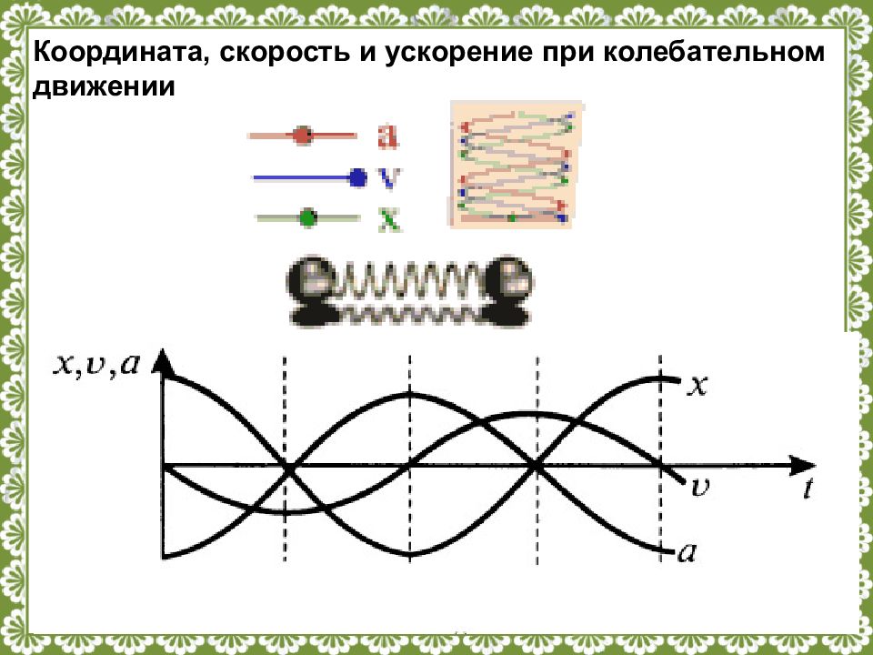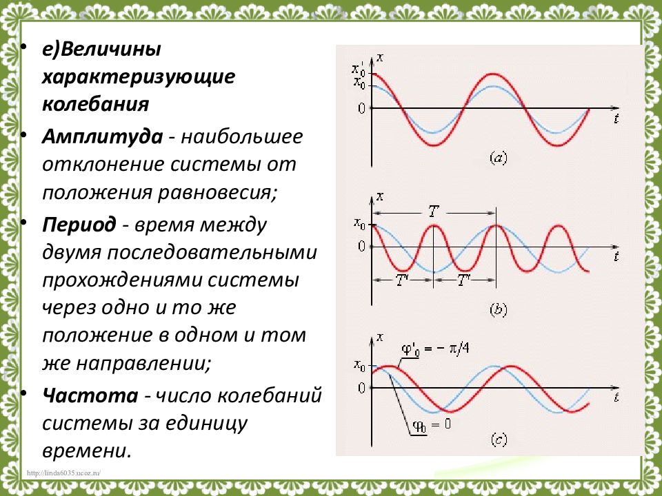 е)Величины характеризующие колебания Амплитуда - наибольшее отклонение системы от положения равновесия; Период - время между двумя последовательными прохождениями системы через одно и то же положение в одном и том же направлении; Частота - число колебаний системы за единицу времени.