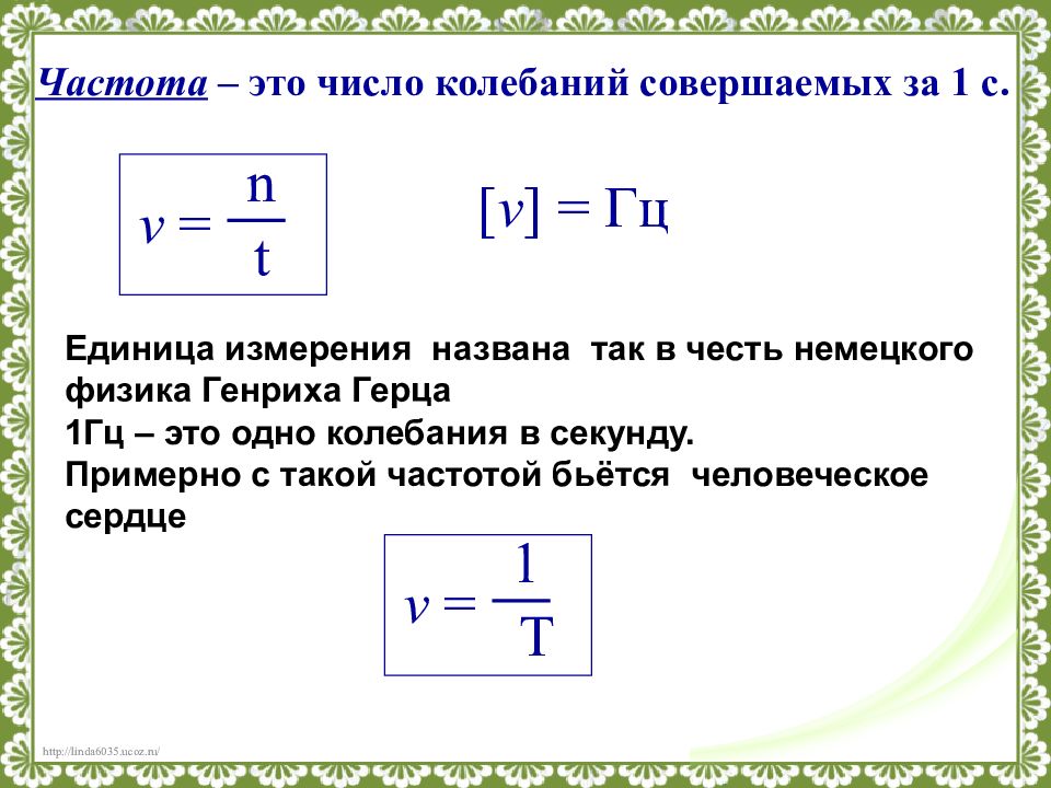 Частота – это число колебаний совершаемых за 1 с. v = n t [ v ] = Гц Единица измерения названа так в честь немецкого физика Генриха Герца 1Гц – это одно колебания в секунду. Примерно с такой частотой бьётся человеческое сердце v = 1 T