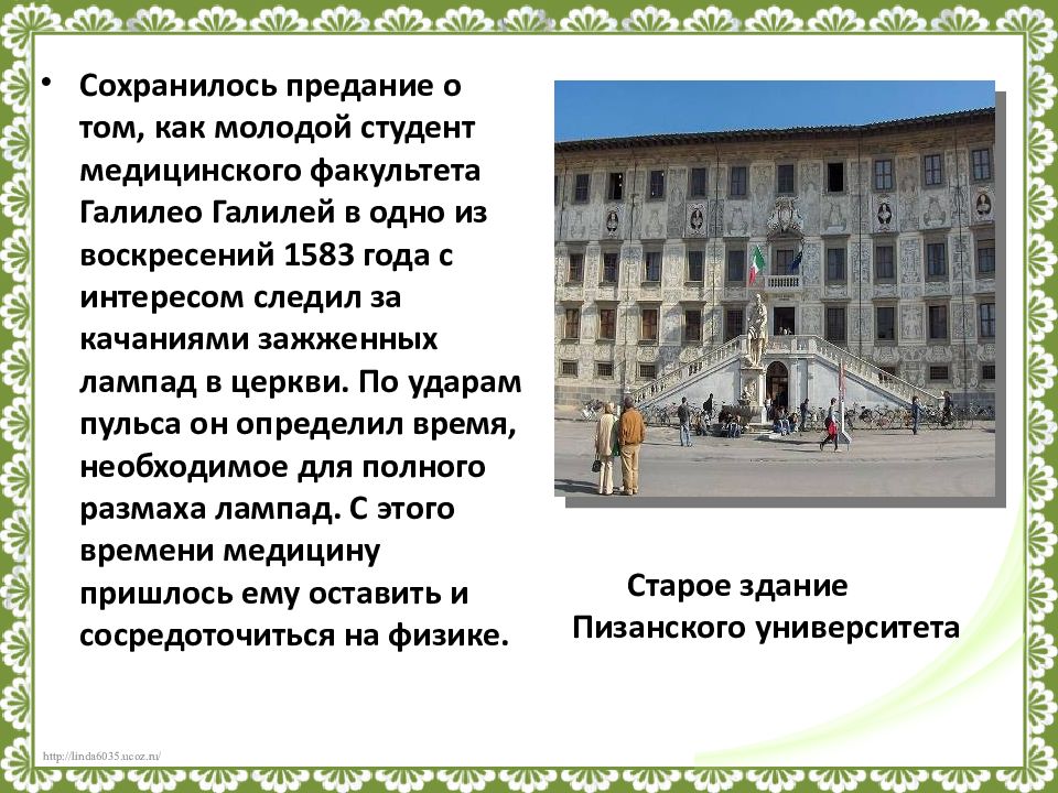 Сохранилось предание о том, как молодой студент медицинского факультета Галилео Галилей в одно из воскресений 1583 года с интересом следил за качаниями зажженных лампад в церкви. По ударам пульса он определил время, необходимое для полного размаха лампад. С этого времени медицину пришлось ему оставить и сосредоточиться на физике. Старое здание Пизанского университета
