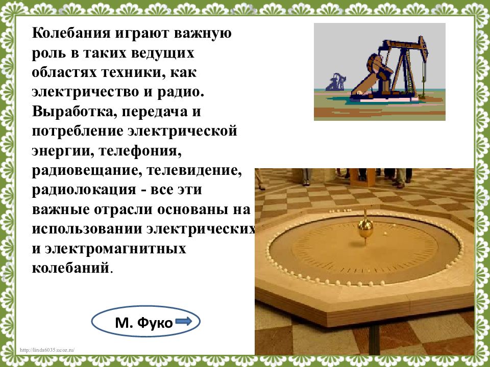 Колебания играют важную роль в таких ведущих областях техники, как электричество и радио. Выработка, передача и потребление электрической энергии, телефония, радиовещание, телевидение, радиолокация - все эти важные отрасли основаны на использовании электрических и электромагнитных колебаний. М. Фуко