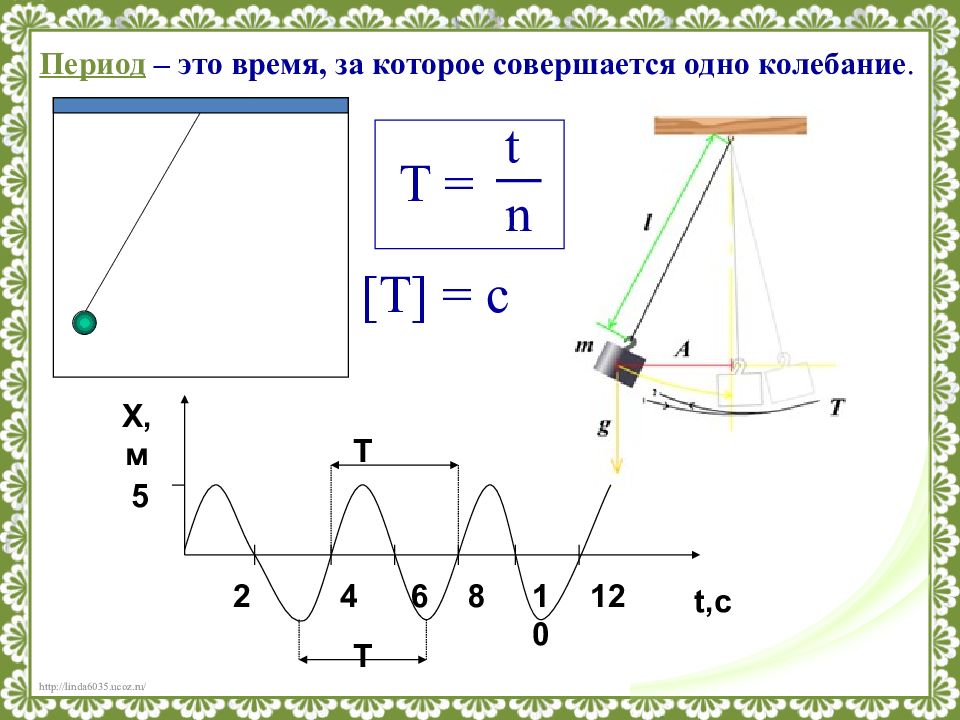 Период – это время, за которое совершается одно колебание. [T] = с t T = n X, м t,с 5 2 4 6 8 10 12 Т Т