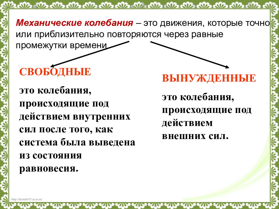СВОБОДНЫЕ это колебания, происходящие под действием внутренних сил после того, как система была выведена из состояния равновесия. ВЫНУЖДЕННЫЕ это колебания, происходящие под действием внешних сил. Механические колебания – это движения, которые точно или приблизительно повторяются через равные промежутки времени