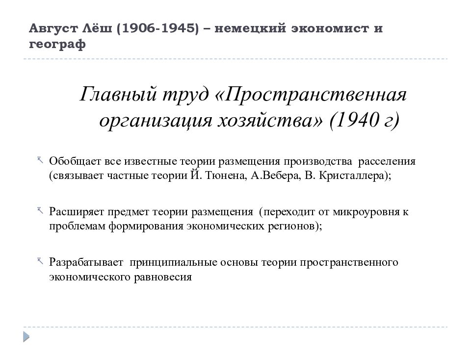 Главный труд «Пространственная организация хозяйства» (1940 г) Обобщает все известные теории размещения производства расселения (связывает частные теории Й. Тюнена, А.Вебера, В. Кристаллера ); Расширяет предмет теории размещения (переходит от микроуровня к проблемам формирования экономических регионов); Разрабатывает принципиальные основы теории пространственного экономического равновесия