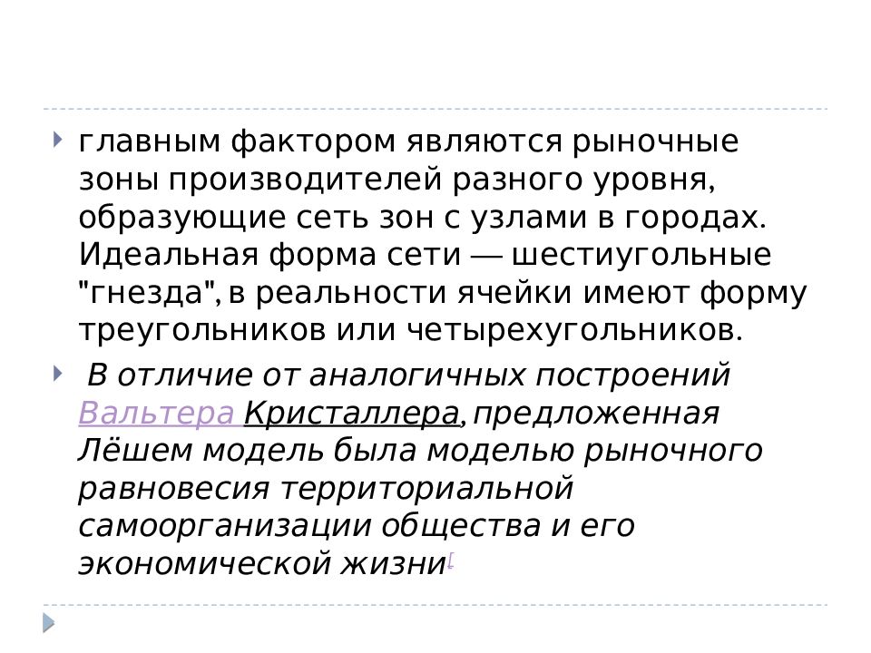 местоположение каждой фирмы характеризуется максимально возможными преимуществами для потребителей и производителей; фирмы размещаются так, что территория используется полностью; существует равенство цен и издержек(нет избыточного дохода); все рыночные зоны имеют минимальный размер (в виде шестиугольников ); границы рыночных арен проходят по линиям безразличия (изолиниям), что по мнению А. Лёша обеспечивает устойчивость найденного равновесия