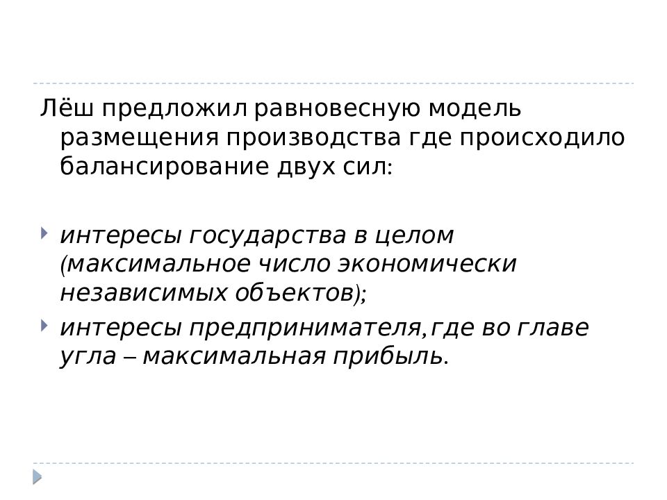 Лёш предложил равновесную модель размещения производства где происходило балансирование двух сил: интересы государства в целом (максимальное число экономически независимых объектов); интересы предпринимателя, где во главе угла – максимальная прибыль.